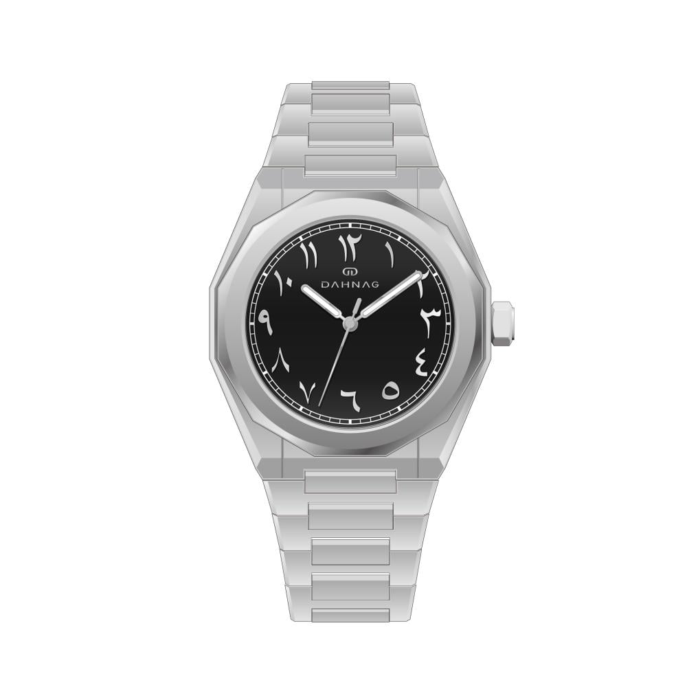 ساعة رجالية في غاية الأناقة من ماركة دهنج تم تصميمها في سويسرا بقطر 41 مليمتراً، بسير من الستانلس ستيل باللون الفضي بميناء بلون الأسود بأرقام عربية و طوق بتفاصيل أنيقه و فخمة