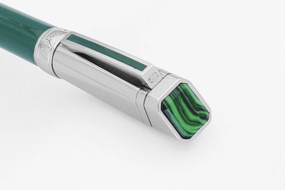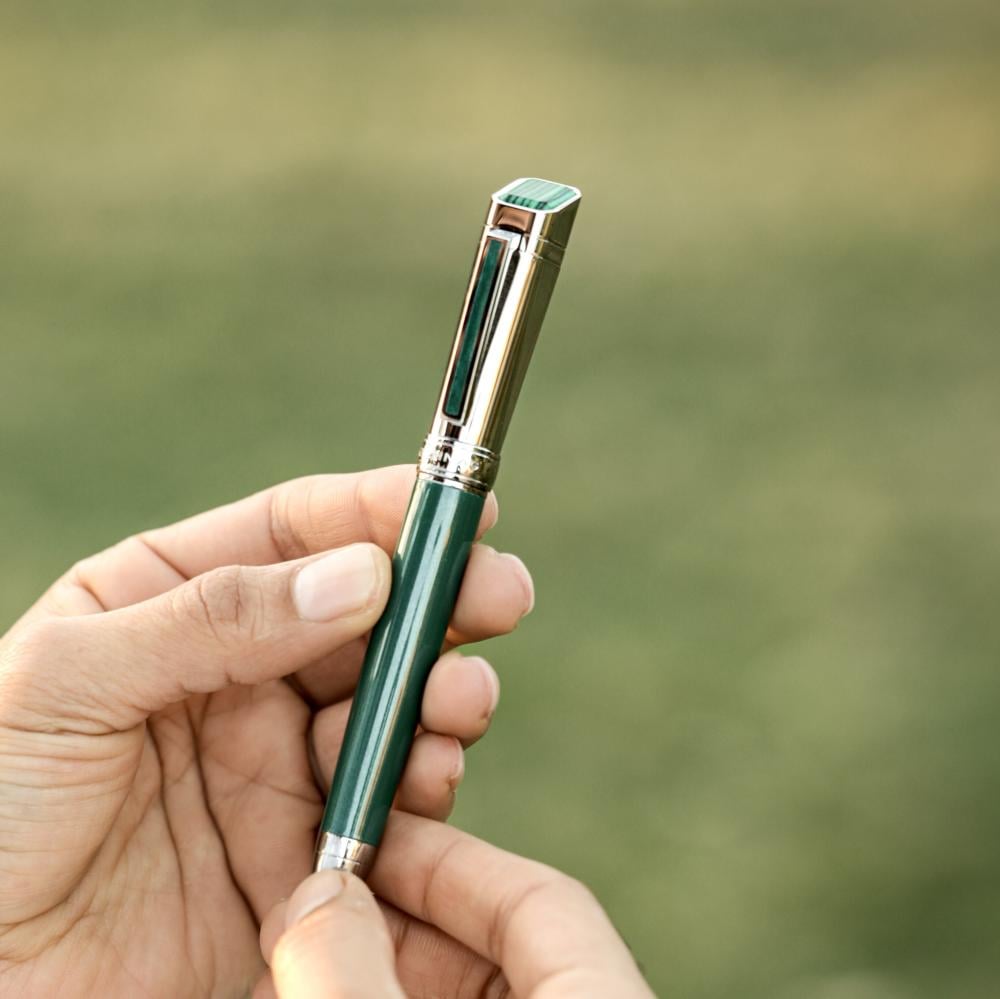 ما بين دقة التصنيع وأناقة التصميم تم إنتاج قلم مزين حيث تعكس هذه التفاصيل مدى فخامة هذا القلم الذي يتسم بالحداثة والرقي. يأتي القلم بتصميم مميز وشكل جذاب. بينما تُكسبه الوانه العصرية شكل استثنائي، كما يكتسب فخامة لا توصف بسبب احتوائه على حجر الملاكيت الذي يعد من أفخم الأحجار الكريمة الطبيعية.