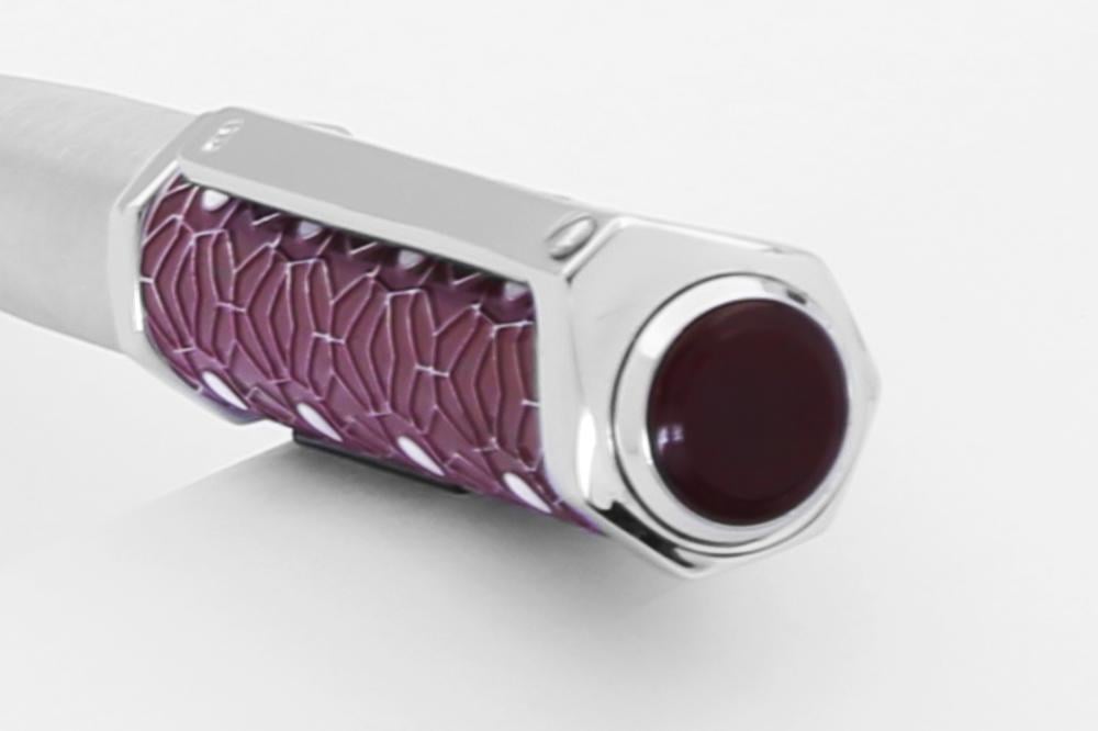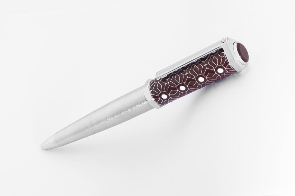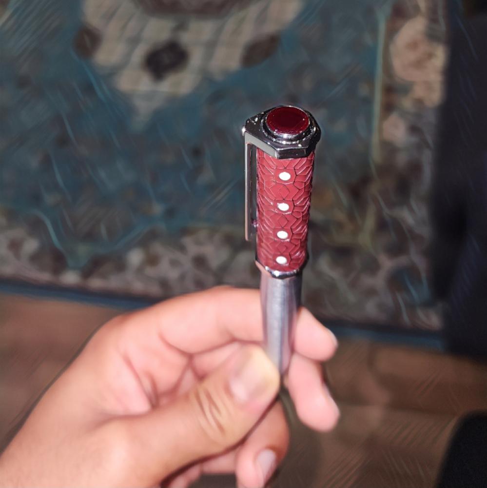 - تفاصيل أنيقة وفاخرة: إذ يكتسب ذلك القلم مزيد من الفخامة والرقي بفضل احتوائه على حجر عنابي اللون من أفخم أنواع الأحجار الكريمة.