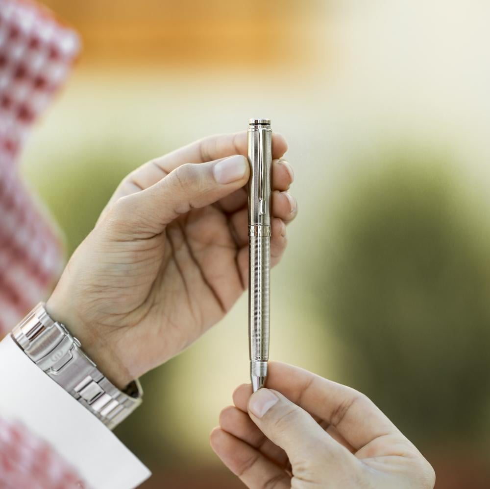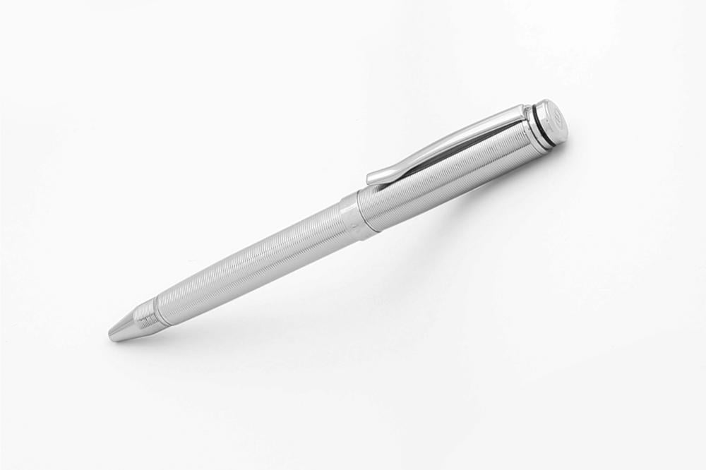 قلم حبر جاف (بولبوينت) من مجموعة ديزاين دهنج غطاء وهيكل من المعدن المصقول بالوان الفضي الكامل و نقشة على كامل القلم و تفاصيل مطلية بالبلاديوم ولون خط أسود في قمة القلم من أجمل أصدارات 2025