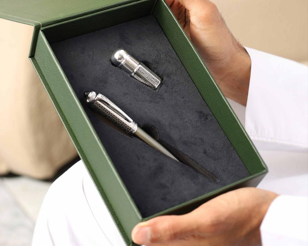 - يحتوي الطقم على باكدج مميزة تجمع بين قلم حبر شيك وقيم وعطر أصلي من أجود أنواع العود الملكي.