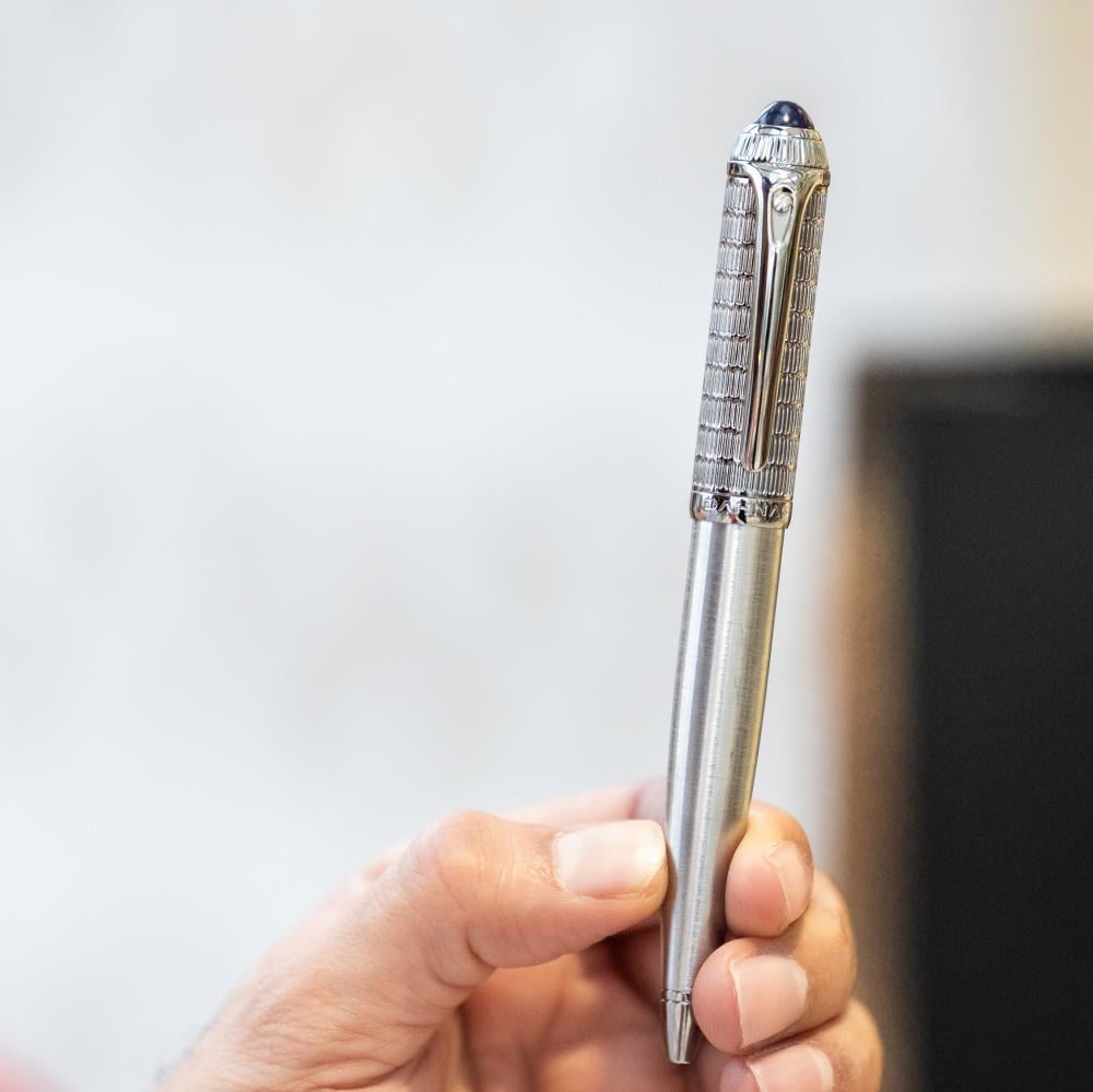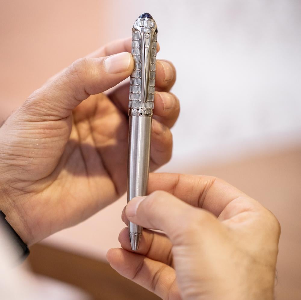 - تصميم راقي وتفاصيل استثنائية: يتمتع القلم بتصميم بسيط غاية في الرقي، فضلاً عن احتوائه على حجر طبيعي أزرق اللون وزخرفة أنيقة تُضفي عليه لمسة عصرية مميزة.